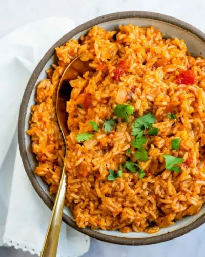 Ecco il nostro nuovo preferito lato facile da abbinare ai tacos: riso spagnolo! In realtà non è affatto spagnolo, ma riso rosso in stile messicano. Questa ricetta è semplice e veloce: utilizza la salsa per ottenere rapidamente un sapore intenso e la salsa adobo per un sottotono affumicato. Diventerà un punto di riferimento in pochissimo tempo! Se hai una pentola a pressione, prova Riso spagnolo istantaneo .