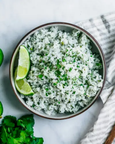 Aggiungi coriandolo, succo di lime e scorza di lime al tuo riso, lo catapulta a un livello completamente diverso! I modi per servirlo sono infiniti: usarlo come contorno per accompagnare tacos, ciotole di burrito , Mi mancano anche le enchiladas, spiedini di gamberi alla griglia e altro ancora. Suo incredibilmente versatile e ci ritroviamo a farlo spesso. Davvero, ogni pasto è migliore con un po' di riso al coriandolo e lime!