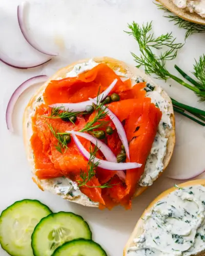 Questo Bagel al salmone affumicato è l'ideale per un brunch con bagel! Prepara un grande piatto con bagel e diversi tipi di crema di formaggio e condimenti per bagel, ed è l'ideale per un pigro brunch con gli amici. Ecco alcune idee su cosa avere a portata di mano per un brunch con bagel:
