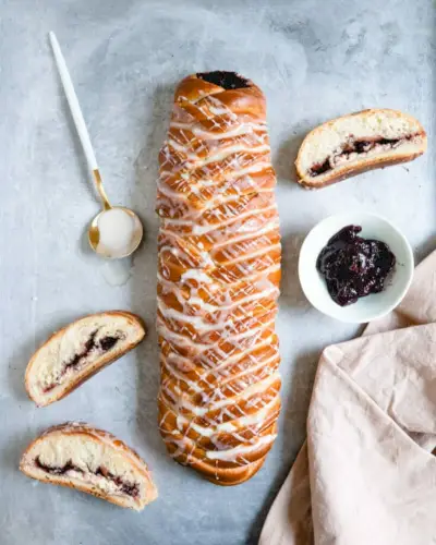 Questa ricetta di pane intrecciato è uno spettacolo completo di ricette per il brunch! Il pane ha un ripieno di marmellata di lamponi e crema di formaggio al limone. Ecco come preparare il pane challah, riempirlo e intrecciarlo. Non è così difficile come sembra!