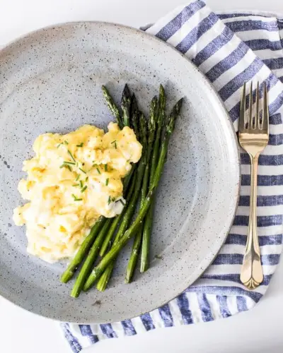 Il prossimo passo nelle nostre ricette per il brunch: fantasiose uova strapazzate! Queste soffici uova strapazzate con formaggio di capra si uniscono rapidamente e il formaggio di capra piccante aggiunge un tocco elevato. Sono perfetti per una colazione speciale o un brunch con contorno di asparagi. Oppure, se sei vegano o a base vegetale, prova una frittura di tofu!