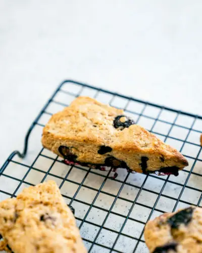 Gli scones sono la ricetta perfetta per il brunch! Non c'è niente di più accogliente per il brunch del fine settimana di una fragrante infornata di focaccine al forno. Questi sono perfettamente friabili con mirtilli piccanti e uno scricchiolio di zucchero turbinado in cima! Sono perfetti per il brunch o per l'intrattenimento. Un seguace ha detto: 'La mia famiglia recensisce gli scones ai mirtilli con 7 pollici in su!'