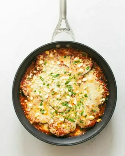 E, ultimo ma non meno importante, nei nostri piatti vegetariani per i mangiatori di carne: melanzane alla marinara in padella! Questo non prevede l'impanatura o la frittura delle melanzane. Invece cuocilo al forno e mettilo in una padella con una marinara piccante di alta qualità, mozzarella e feta. Si riunisce in una bontà appiccicosa. Servire con spaghetti o pane all'aglio per un pasto soddisfacente.