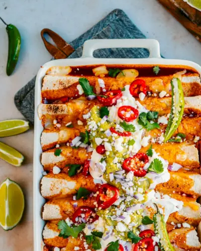 Ecco un pasto facile per i mangiatori di carne progettato per funzionare in 30 minuti netti: queste facili enchiladas vegetariane! Il ripieno non richiede tempo per essere preparato: sono solo fagioli borlotti speziati e spezie. Arrotolali, cuocili fino a quando diventano dorati e formaggiosi e riempili con tutti i tuoi condimenti preferiti.