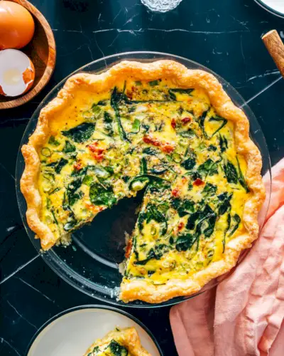 È saporito, nutriente e funziona colazione , brunch , oppure una cena leggera: è la quiche! Una buona ricetta di quiche può spostare le montagne (pensiamo). Questa quiche ha un semplice ripieno di cipolla, aglio, spinaci e pomodori secchi, ed è racchiusa in una crosta di pasta sfoglia dorata.