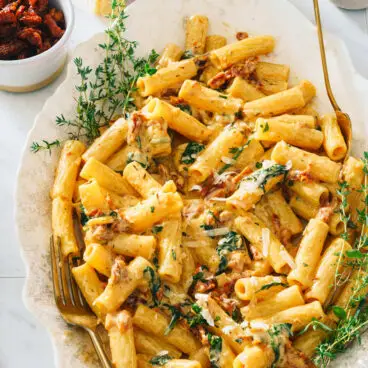 In cima alle nostre ricette preferite con i pomodori secchi c'è questa cremosa pasta ai pomodori secchi! C'è un grande fattore wow in questa pasta, che si prepara in soli 30 minuti. I pomodori secchi terrosi e fruttati conferiscono a questo una qualità carnosa piatto vegetariano facile , che è bagnato in un parmigiano salsa di panna .