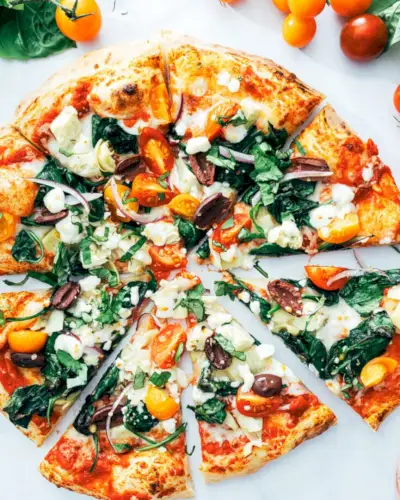 C'è così tanto da fare in questa pizza mediterranea: feta salata, basilico pepato, olive salate di Kalamata e pomodori secchi piccanti, il tutto spalmato sulla nostra migliore pizza. salsa per pizza . È una celebrazione della luminosità Sapori mediterranei è perfetto per intrattenere... o per una cena durante la settimana.