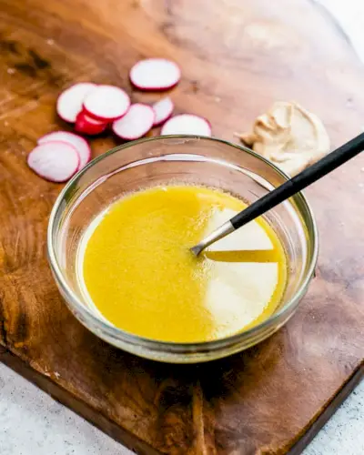 Preparare il condimento per l'insalata tahini non potrebbe essere più semplice! Funziona come salsa per condire o come condimento cremoso per l'insalata. Basta sbattere insieme la tahina e il succo di limone fresco, quindi aggiungere l'olio d'oliva, sale e un po' di sciroppo d'acero per bilanciare i sapori.