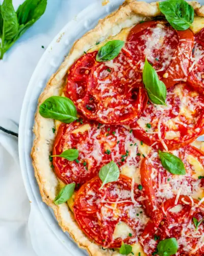 Tenetevi forte il cappello: ecco il nuovo modo migliore per utilizzare i pomodori estivi in una ricetta vegetariana. Torta al pomodoro! Questo è così ricco di sapore che potrebbe essere il migliore su Internet. Un'affermazione audace, ma ascoltaci. C’è la crosta di pasta sfoglia, burrosa e profumata di timo. C'è un ripieno appiccicoso e di formaggio: intensamente saporito da un po' di maionese e senape di Digione, mescolato con due formaggi. E la parte migliore: due strati di pomodori estivi maturi, succosi e belli. Cavolo, pensiamo che sia dannatamente perfetto.