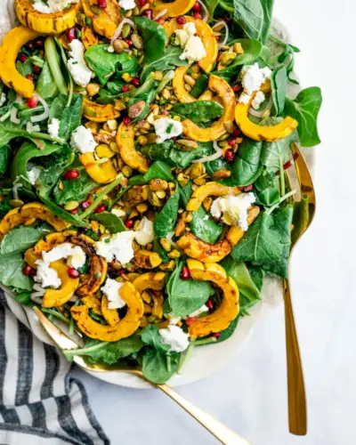 Alla ricerca di uno straordinario Insalata del Ringraziamento? Inserisci: insalata di zucca delicata! Questa non è una normale insalata verde. Ha come protagonista la nostra zucca preferita: la delicata, che è straordinariamente dolce e ha la buccia commestibile (non è necessario sbucciarla!). Arrostisci la zucca in soli 20 minuti e nel frattempo prepara i rinfrescanti semi di melograno, i pistacchi croccanti e il piccante condimento alla senape al miele.
