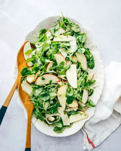 Ecco una gustosa insalata del Ringraziamento: insalata di crescione con mele! Abbina questa verdura a foglia amara con limone, mela e scaglie di parmigiano salato e non potrai resistere a un altro morso! La mela dolce, gli agrumi piccanti e il sale a scaglie bilanciano magnificamente il crescione, creando un contorno fresco e vivace.