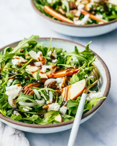 Ecco un'insalata semplice del Ringraziamento che si prepara rapidamente, ma la mia offre sapore! La croccantezza delle mele, il cremoso formaggio di capra e la soffice rucola sono la coppia ideale per il condimento dolce e piccante. I tuoi ospiti non potranno smettere di mangiarlo!