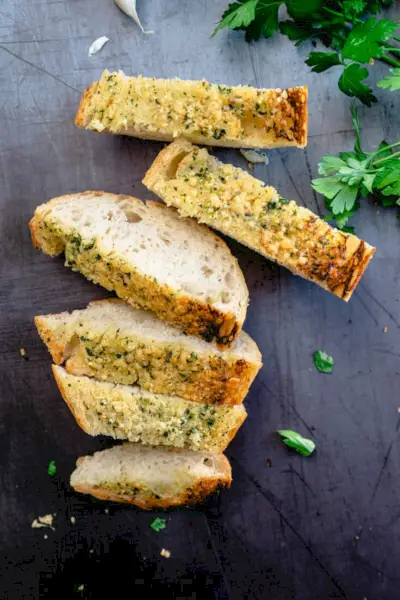 Ecco una ricetta di pane all'aglio corto e pieno di sapore! Abbina aglio fresco, aglio essiccato e olio d'oliva per un'enorme esplosione di sapore all'aglio su un croccante baguette tostata . È vegano e pieno di sapore: ottimo se mangi prodotti vegetali o semplicemente non hai formaggio in frigorifero. E il sapore è così buono che non ti mancherà mai.