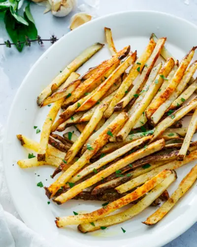 Un appello a tutti gli amanti dell'aglio: queste patatine fritte all'aglio sono il tuo nuovo contorno preferito! Cuocerli croccanti e tiepidi dal forno, quindi condirli con aglio in polvere e olio all'aglio fatto in casa. Prendi un morso e sono irresistibilmente agliati, ma non così intensi da doverti lavare immediatamente i denti (o ricevere lamentele dal tuo partner!).