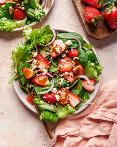 Le fragole sono un sapore naturale che si abbina all'acidità dell'aceto balsamico. Quindi per questa insalata abbiamo usato la nostra preferita salsa vinaigrette balsamica per accentuare perfettamente le bacche dolci di colore rosso vivo. Abbinato a cipolle rosse e mandorle tostate, è un contorno semplice e delizioso che piace a tutti!