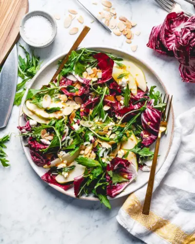 Questa insalata di radicchio è una vibrante esplosione di sapori e consistenze, ed è il contorno perfetto per la pizza! Le foglie amare e violacee del radicchio sono bilanciate dalla dolcezza delle pere mature, dall'appagante croccantezza delle mandorle tostate, dal cremoso sapore del formaggio di capra e da una piccante vinaigrette agli agrumi che lega il tutto.