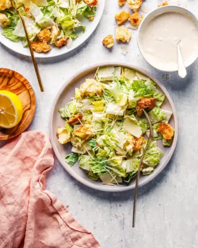 Condita con una cremosa salsa Caesar fatta in casa e croccante crostini , questa classica ricetta dell'insalata Caesar è un'insalata che non vorrai smettere di mangiare! Il condimento è deliziosamente cremoso e i crostini sono croccanti e all'aglio. Rende la serata della pizza completa!