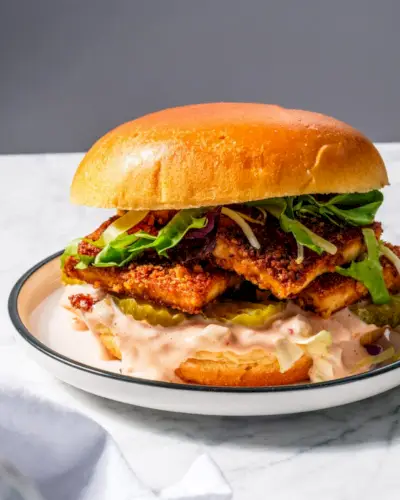 Benvenuto nel panino dei tuoi sogni! Questo incredibile panino vegano è caratterizzato da tofu impanato croccante, salsa russa piccante e sottaceti croccanti che creano un'esplosione di sapori che tutti adoreranno.
