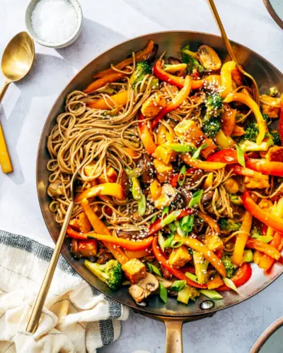 Ecco un modo divertente per infondere un sacco di verdure nella tua vita: in 30 minuti! Questo pasticcio di verdure vivaci è gustoso proprio come sembra. È tutto ricoperto da una salsa piccante e piccante vegana saltata in padella che vorrai condire praticamente su tutto. Adoriamo servire con i soba noodles per un pasto di 30 minuti.