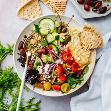 - Completare con hummus, cetriolo a fette, cipolle rosse a fette, pomodori a fette, olive e formaggio feta. Mangia con spicchi di pita, usando l'hummus come salsa/condimento per le verdure.