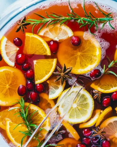 Hai bisogno di un'ottima ricetta per il punch per le vacanze? Prova questo punch di Natale! Il sapore è fruttato e delizioso, con un po' di brillantezza data dal ginger ale. Puoi farlo con il rum per un punch alcolico, oppure ometterlo per quello analcolico. Ad ogni modo, ha un sapore incredibile! La parte migliore? Guarnirlo con agrumi a fette, rami di rosmarino e mirtilli rossi. Non potrebbe essere più festoso o bello.