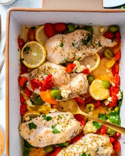 Ecco una ricetta che vince ogni sera della settimana: pollo greco! Adoriamo i pasti in padella dall'aspetto impressionante, e questo Pasto in stile mediterraneo ha carisma da vendere. Cuocere il pollo con pomodori, olive, aglio, limone e feta e ne uscirà con bellissimi sapori audaci.