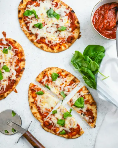 Quando abbiamo bisogno di una cena super veloce, pensiamo alla pizza naan! Capisci questo: è più veloce della consegna della pizza, più sano, E ha un sapore migliore. Allora perché ordinare quando puoi preparare una gustosa pizza? È per quelle sere in cui hai bisogno della cena in tavola senza pensarci troppo. Al giorno d'oggi il pane naan confezionato è facile da trovare, il che rende facile correre al negozio durante una corsa per la pizza naan.