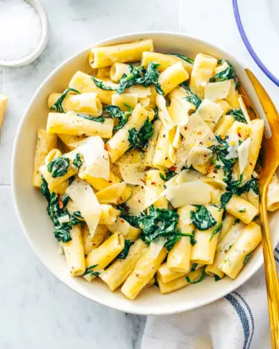 Vuoi mangiare le tue verdure e amarle? Prova questa cremosa ricetta di pasta agli spinaci, con pasta gommosa al dente e un'irresistibile salsa di crema all'aglio e parmigiano! Il modo in cui la salsa cremosa e l'aglio accentuano le verdure a foglia lo rendono uno dei nostri migliori ricette di pasta vegetariana fino ad oggi. Accomodati in una ciotola ed è decisamente vivificante.