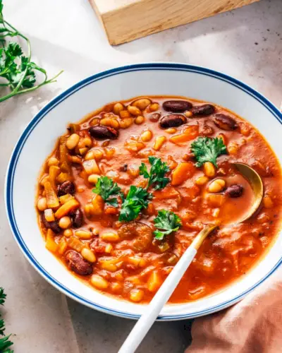 Ecco una ciotola accogliente che è così sostanziosa e soddisfacente che non vorrai mai mettere giù il cucchiaio. Prova questo zuppa di fagioli sostanziosa e facile! Fate spazio nel vostro cuore a questa ricetta, perché abbaglia . Fagioli rossi e fagiolini galleggiano in un brodo saporito e affumicato di pomodori arrostiti al fuoco che ha la giusta consistenza lucida. Utilizza fagioli in scatola, ma ha il sapore di aver bollito a fuoco lento tutto il giorno.