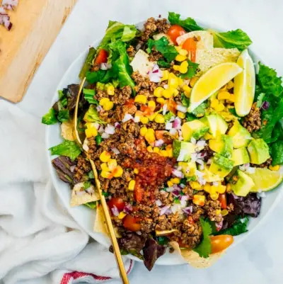 Alla ricerca di idee semplici per una cena senza glutine e senza latticini? Insalata vegana di tacos in soccorso! Questa ricetta geniale ti arriva grazie alla magia di Carne di tacos alle noci : un modo gustoso per preparare una versione vegetale della carne macinata. Si scopre che noci, funghi e spezie svolgono un ottimo lavoro nel simulare la gustosa bontà delle briciole di carne. Completare con salsa e buon divertimento.