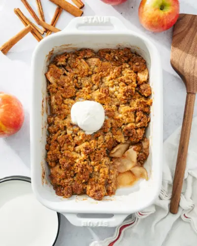 Questa mela croccante è così buona che nessuno si rende conto che è senza glutine e senza latticini. La copertura sbriciolata è deliziosamente croccante e ricopre uno strato accogliente e appiccicoso di mele speziate e crostate dolci. Servilo con gelato alla vaniglia e non c'è davvero niente di meglio! L'abbiamo servito ad amici e parenti che non avevano idea che non contenesse farina. In effetti, potrebbe piacerci di più rispetto al nostro standard mela croccante !
