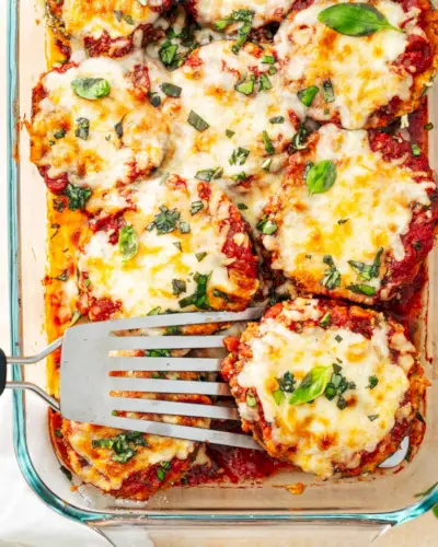 Ha formaggio frizzante, salsa di pomodoro all'aglio e melanzane impanate e saporite: è la parmigiana di melanzane! Questa classica ricetta per la cena vegetariana è abbondante, abbondante e piace praticamente a tutti. Questa parmigiana di melanzane al forno è più veloce e più facile da preparare a casa rispetto alla maggior parte delle ricette incredibile gusto.