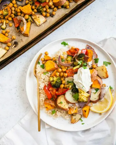 Cerchi idee fresche e salutari per una cena vegetariana? Prova questa ciotola mediterranea, piena di verdure colorate! È un pasto semplice in una ciotola che vede protagonisti verdure arrostite speziate, condite con un irresistibile mix di cumino, coriandolo, aglio e un pizzico di cannella. Aggiungete quinoa o cous cous, cetriolo fresco e pomodoro e completate il tutto con una crema salsa tahin al limone .