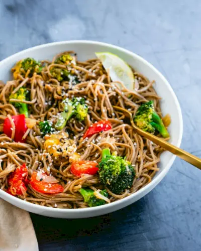 Questo è il pasto veloce settimanale definitivo, una cena vegetariana abbondante che si prepara in 20 minuti netti. Ti presento questa ciotola di noodle soba! È ripieno di broccoli saltati in padella, peperoncino e cipolla, mescolati con una salsa saporita con burro di arachidi cremoso.