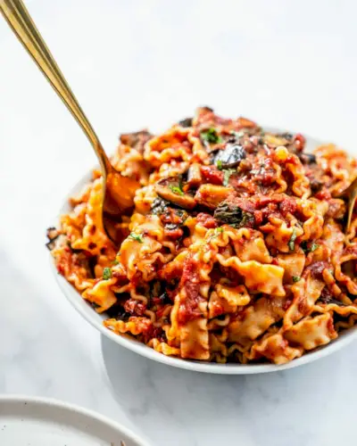 Questa pasta alle melanzane ha tutto! È ricco di sapore saporito e piccante: tenere melanzane arrostite, salsa marinara piccante e basilico pepato. È al 100% a base vegetale, ma non manca nulla nel reparto sapori. Ancora meglio, questo la cena vegetariana è incredibilmente versatile: funziona per i giorni feriali E per aver servito in compagnia!