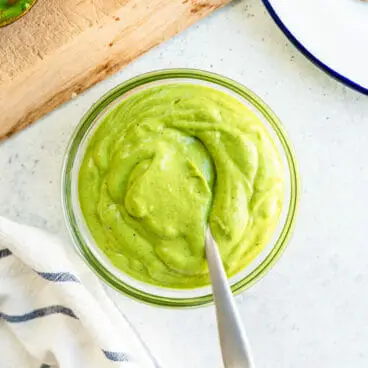 Questo condimento cremoso all'avocado è verde brillante, piccante e saporito, perfetto per condire insalate e piatti in ciotola! Ci vogliono solo pochi minuti per amalgamarsi.