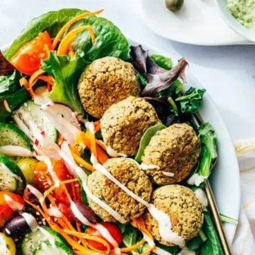Secondo noi, i falafel sono in cima alla classifica di alcune delle migliori ricette vegane del mondo. Queste polpette di ceci mediorientali sono così carnose e soddisfacenti che potremmo mangiarle tutti i giorni. Ecco un modo per rendere parte del pasto quotidiano a base vegetale: questo Insalata di falafel ! Preparane un lotto facilmente falafel al forno , quindi sovrapponili con verdure croccanti e guarnisci con un composto cremoso e piccante salsa tahina . Oppure usa i falafel surgelati acquistati o riutilizza gli avanzi da asporto! Questo è un grande successo per la nostra famiglia: e funziona per i giorni feriali o per le cene.