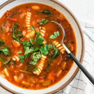 La zuppa di minestrone è una zuppa italiana colorata piena di verdure sostanziose e pasta! Questa ricetta è una ricetta semplice per la cena o il pranzo a base vegetale.