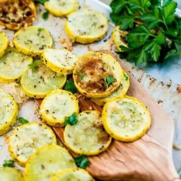 La zucca gialla arrostita è il modo perfetto per servirla! Questo metodo semplice cuoce la zucca estiva con parmigiano ed erbe italiane.