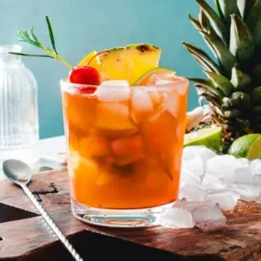- Aggiungi tutti gli ingredienti in un grande bicchiere lowball. Riempire con cubetti di ghiaccio o ghiaccio tritato. Metti un bastoncino da cocktail o un cucchiaio da bar al centro del bicchiere e strofina le mani avanti e indietro sul cucchiaio in modo che giri velocemente. Continuare fino a quando il vetro sarà satinato. Guarnire con ciliegina al cocktail, spicchio di ananas e spicchio di lime.