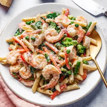 Ma uno dei nostri nuovi preferiti è abbinare i frutti di mare con pasta e verdure fresche primavera dei gamberetti . È come una classica pasta primavera con l'aggiunta di gamberetti e ricoperti da una salsa cremosa e leggera, prepara una cena semplice e soddisfacente in soli 30 minuti.