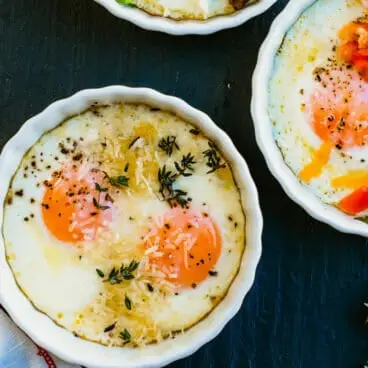 Ecco la parte divertente: aggiungere condimenti alle tue uova al forno! Questo può essere complicato o semplice come preferisci. Il nostro preferito è solo parmigiano ed erbe fresche, il che richiede pochissimo tempo. Ecco alcune idee per far girare le ruote:
