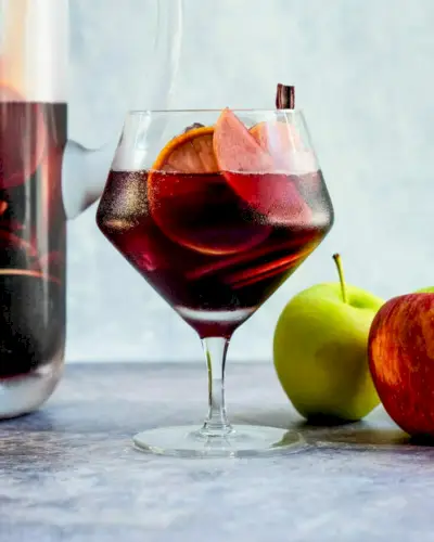 Ecco come continuare a berla anche in inverno: Sangria di mele! Questa bevanda è preparata secondo il tradizionale metodo spagnolo, come la nostra Sangria Rossa Classica . Ciò significa che è aspro e vinoso, invece che carico di zucchero come le versioni americane della bevanda. Ma per trasformarlo in una variazione autunnale, abbiamo utilizzato mele rosse e verdi come frutto e abbiamo aggiunto un pizzico di cannella.
